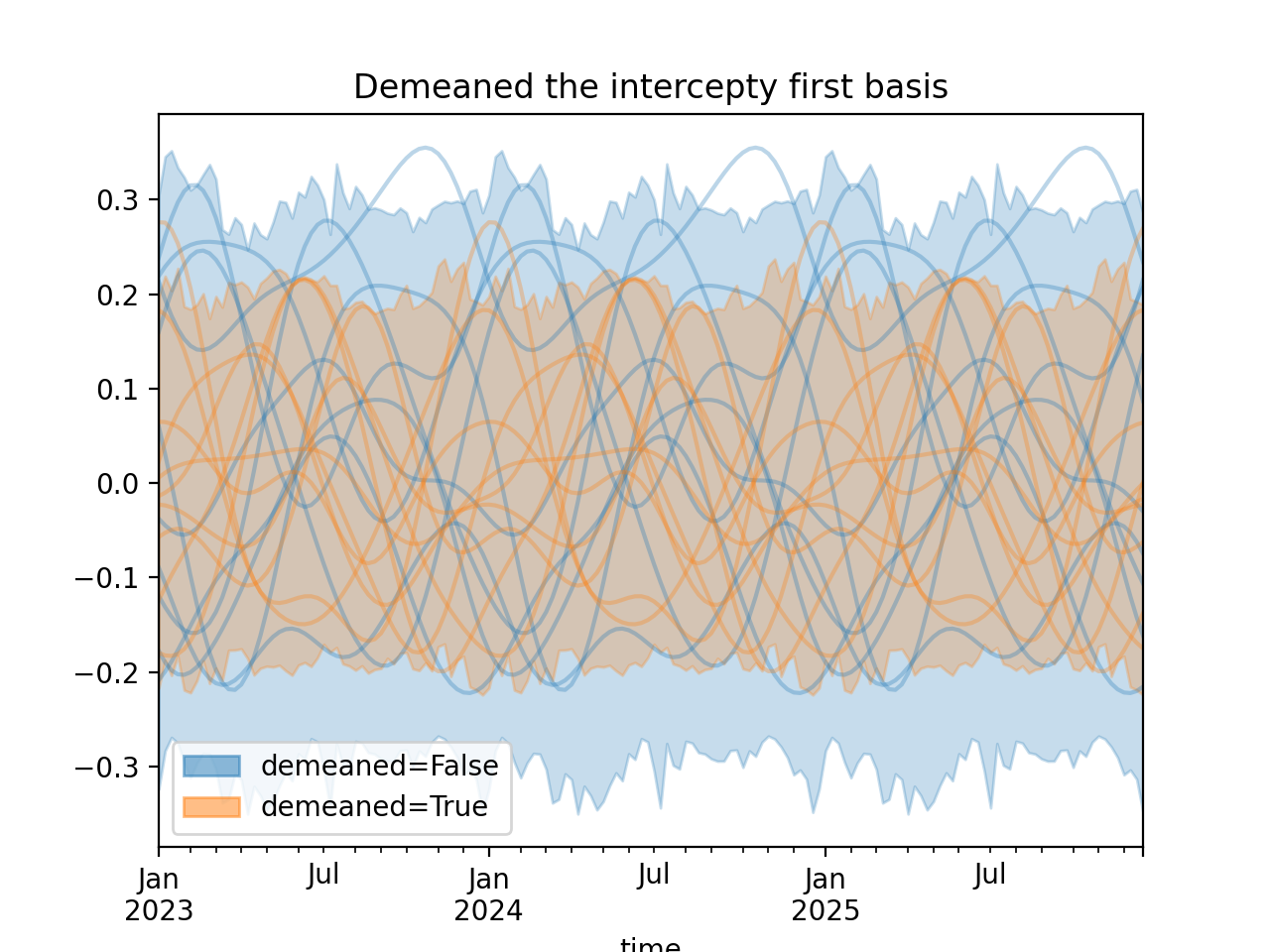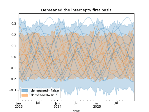 import numpy as np import pandas as pd import xarray as xr import matplotlib.pyplot as plt from pymc_marketing.mmm import HSGPPeriodic from pymc_marketing.plot import plot_curve seed = sum(map(ord, "Periodic GP")) rng = np.random.default_rng(seed) scale = 0.25 ls = 1 kwargs = dict(ls=ls, scale=scale, period=52, cov_func="periodic", dims="time", m=20) n = 52 * 3 dates = pd.date_range("2023-01-01", periods=n, freq="W-MON") X = np.arange(n) coords = {"time": dates} hsgp = HSGPPeriodic(demeaned_basis=False, **kwargs).register_data(X) hsgp_demeaned = HSGPPeriodic(demeaned_basis=True, **kwargs).register_data(X) def sample_curve(hsgp): return hsgp.sample_prior(coords=coords, random_seed=rng)["f"] non_demeaned = sample_curve(hsgp).rename("False") demeaned = sample_curve(hsgp_demeaned).rename("True") combined = xr.merge([non_demeaned, demeaned]).to_array("demeaned") _, axes = combined.pipe(plot_curve, "time", same_axes=True) axes[0].set(title="Demeaned the intercepty first basis") plt.show()