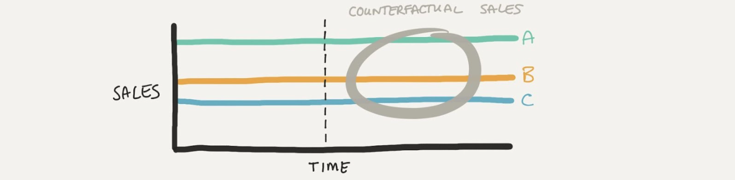 To be more precise, we aren’t really able to make this causal inference based on the sales data before new product introduction. Instead, we do it by comparing the actual product sales after the new product introduction to a counterfactual scenario where the new product was not introduced. This is the essence of causal inference in product incrementality. The question is how do we calculate the counterfactual sales?
