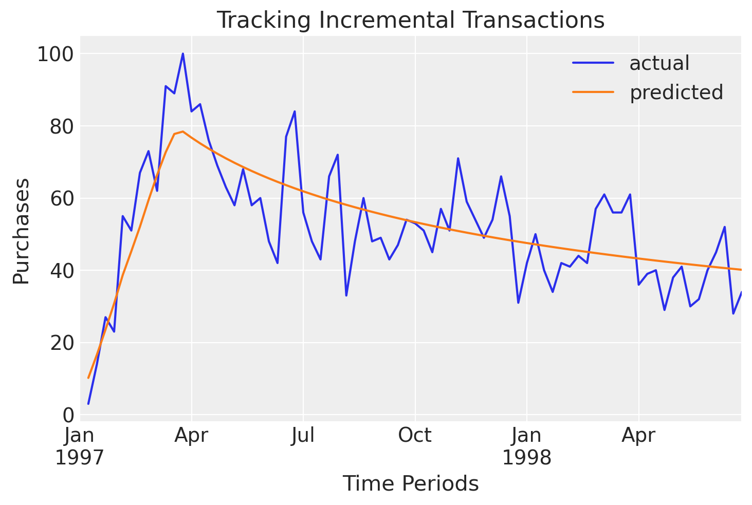 This dataset is an example of continuous time, non-contractual transactions because it comprises purchases from an online music store. PyMC-Marketing provides several models for this use case: