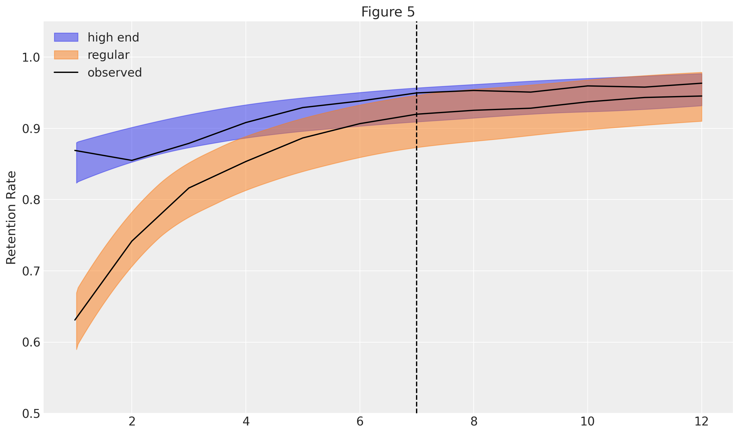 Figures 4 and 5 show the predicted average churn and retention trends for the two groups. We can see that predictions nicely match the observed data (black line), even when extrapolating into the time periods that were held-out when fitting the model.