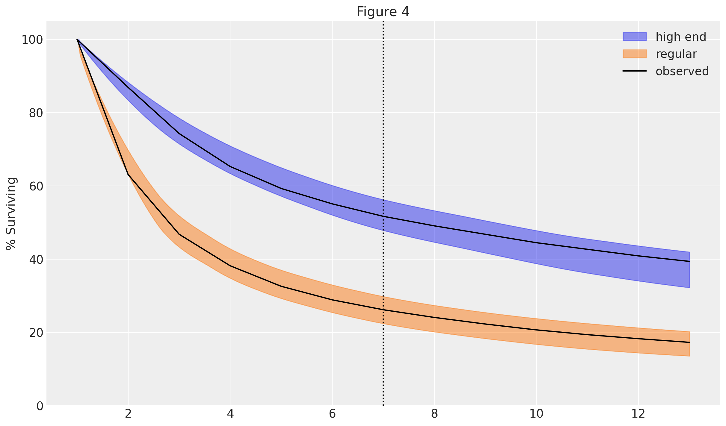 The dataset contains the percentage of customers still enrolled in the service after each time period. There are two distinct groups of users: regular and high-end, believed to have different attrition rates. Each group had 1000 customers at the start.