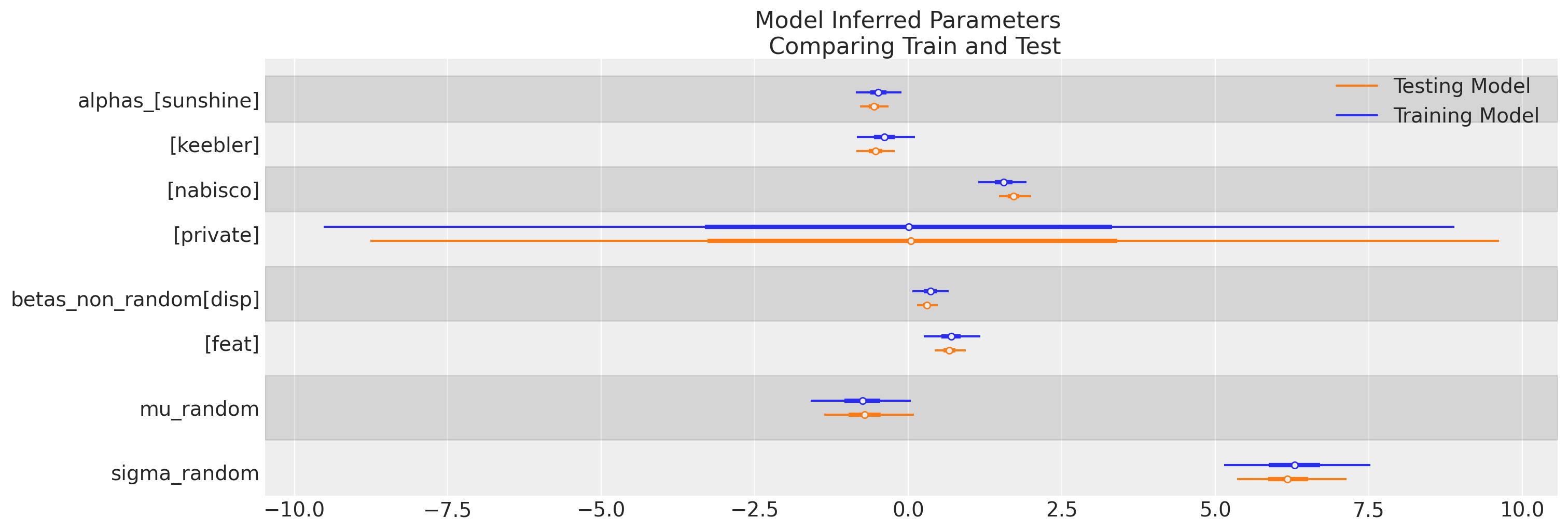ax[0].set_title("Model Inferred Parameters \n Comparing Train and Test");