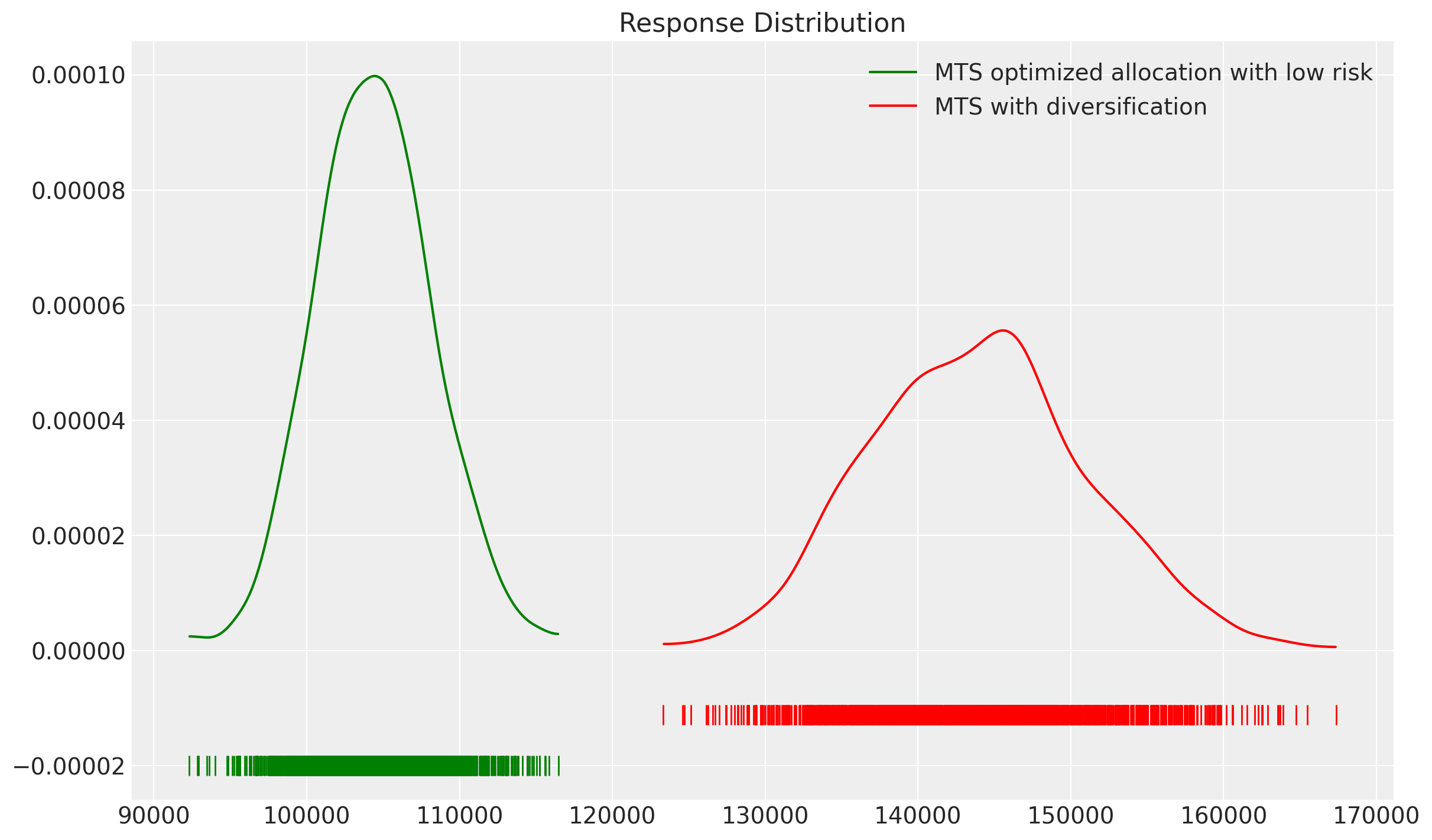 The optimizer is once again allocating the budget to \(X1\) majority, nevertheless \(X2\) it’s getting more money this time. However, this decision is informed by the expectation that the current combination will yield a higher Return on Advertising Spend (ROAS), while also presenting a small lower risk profile compared to the previous allocation.