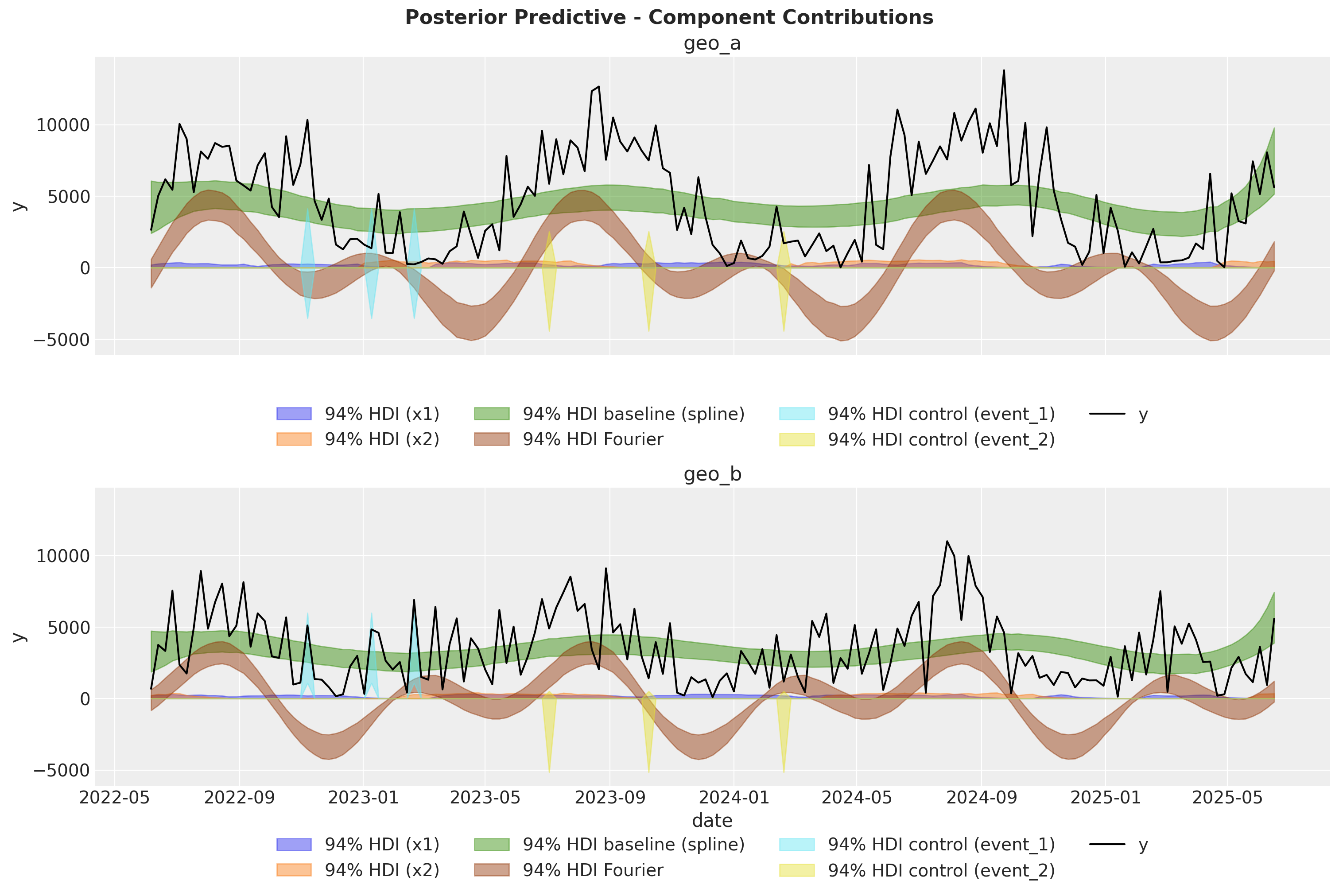 To mirror the multidimensional MMM tutorial workflow, we now extract and visualize the posterior contribution of each component: