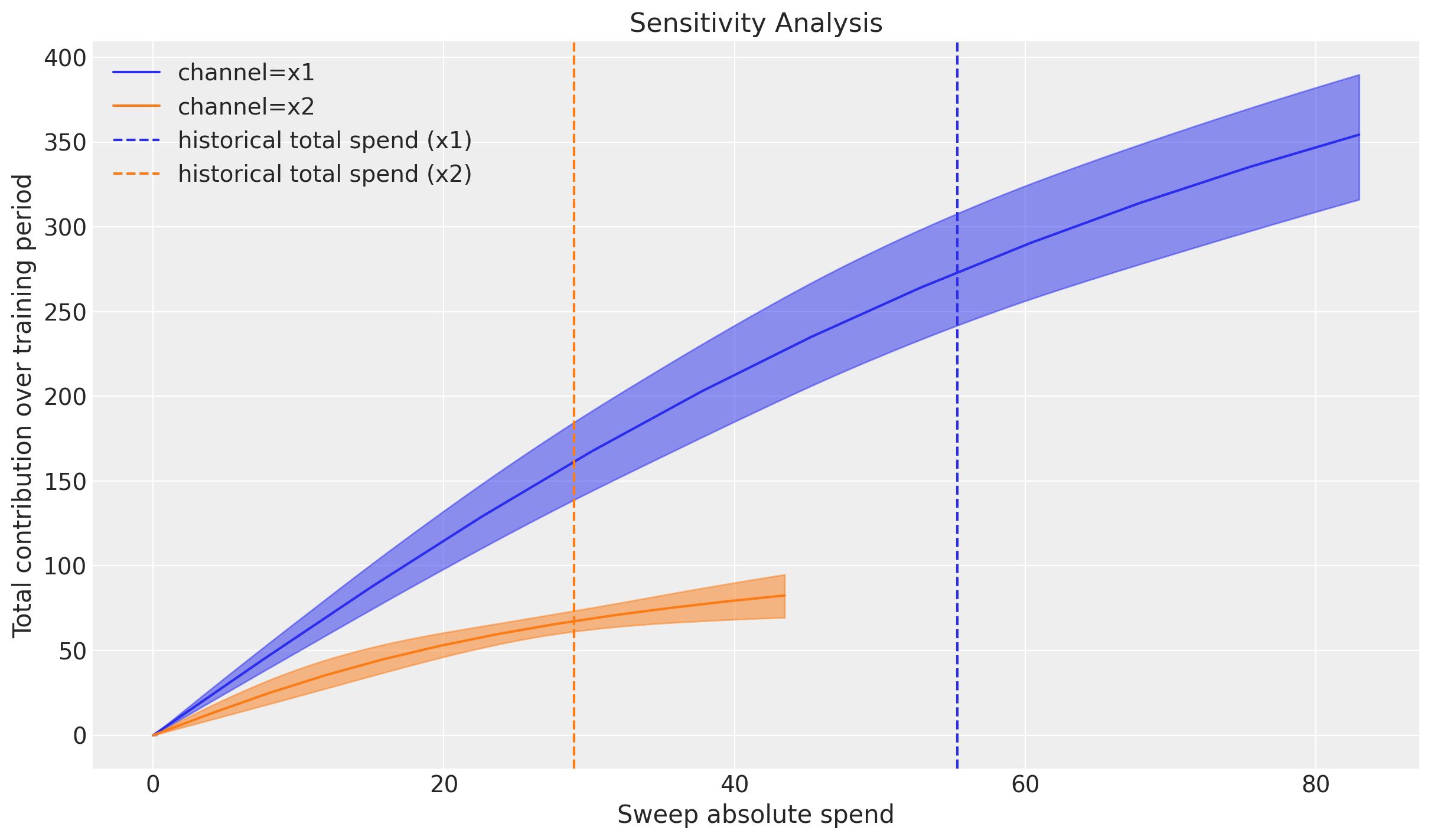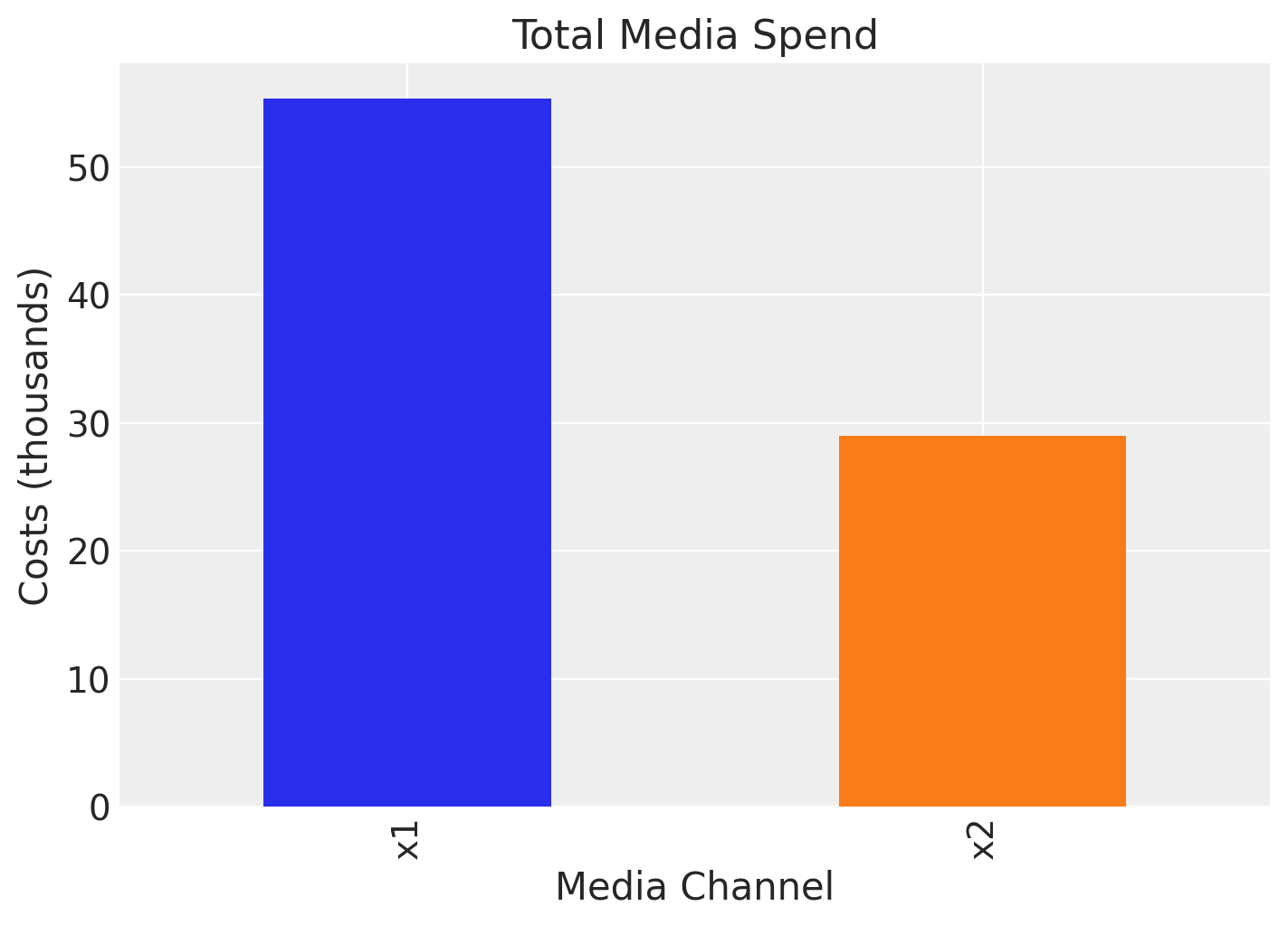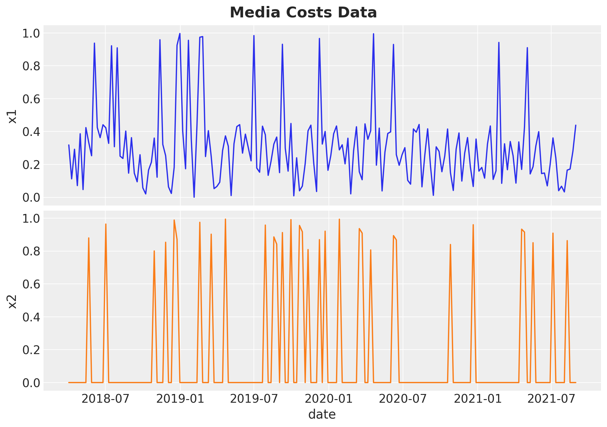 Remark: By design, \(x_{1}\) should resemble a typical paid social channel and \(x_{2}\) an offline (e.g. TV) spend time series.