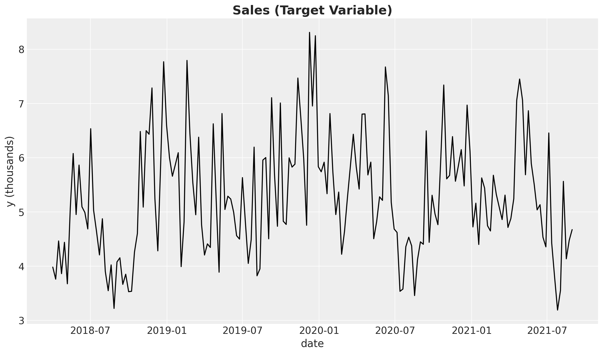 In Part I of this notebook we focus on the data generating process. That is, we want to construct the target variable \(y_{t}\) (sales) by adding each of the components described in the Business Problem section.