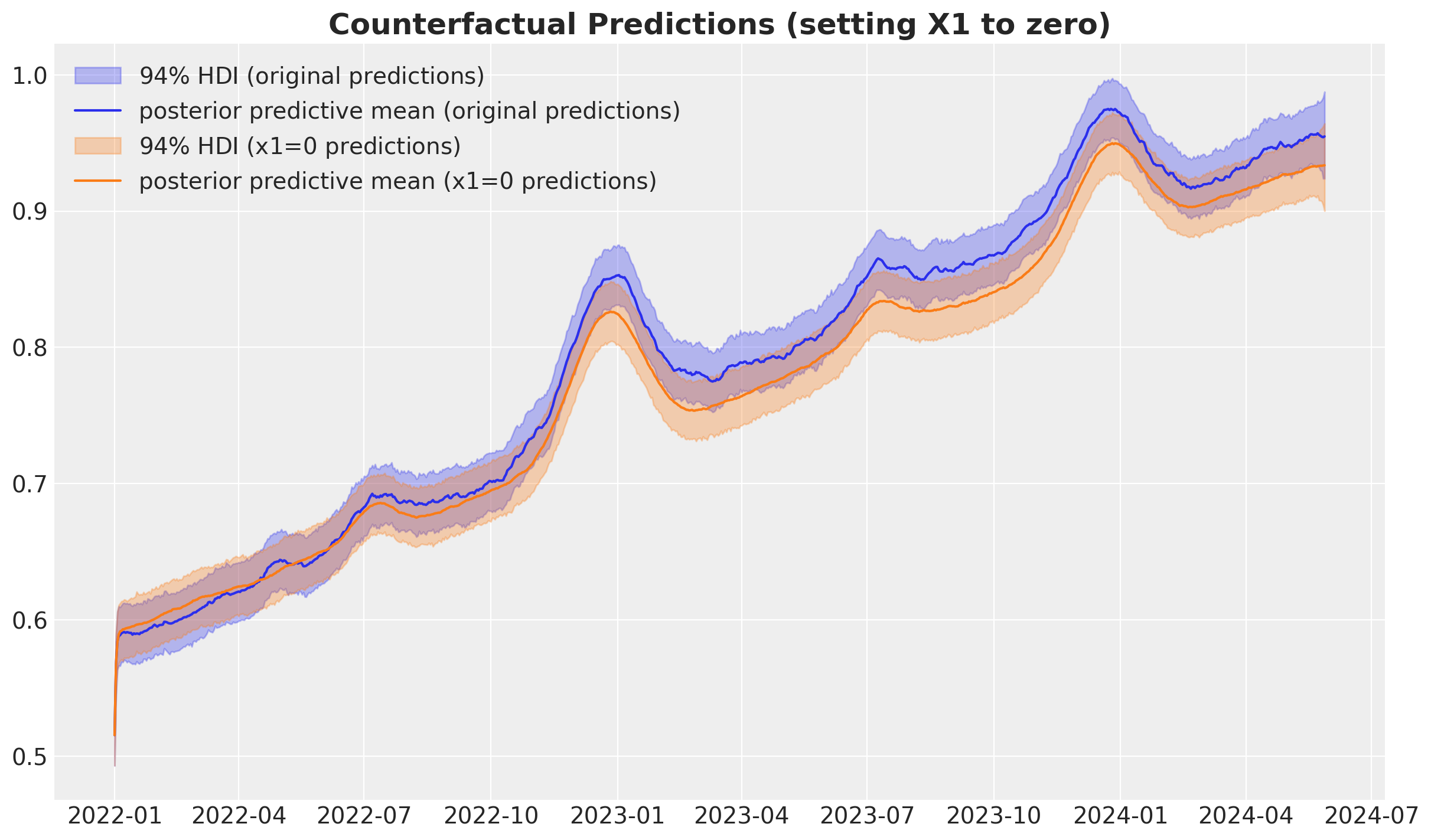 We can now plot the posterior predictive mean of the lower funnel channel with the counterfactual predictions and compare them with the original predictions.