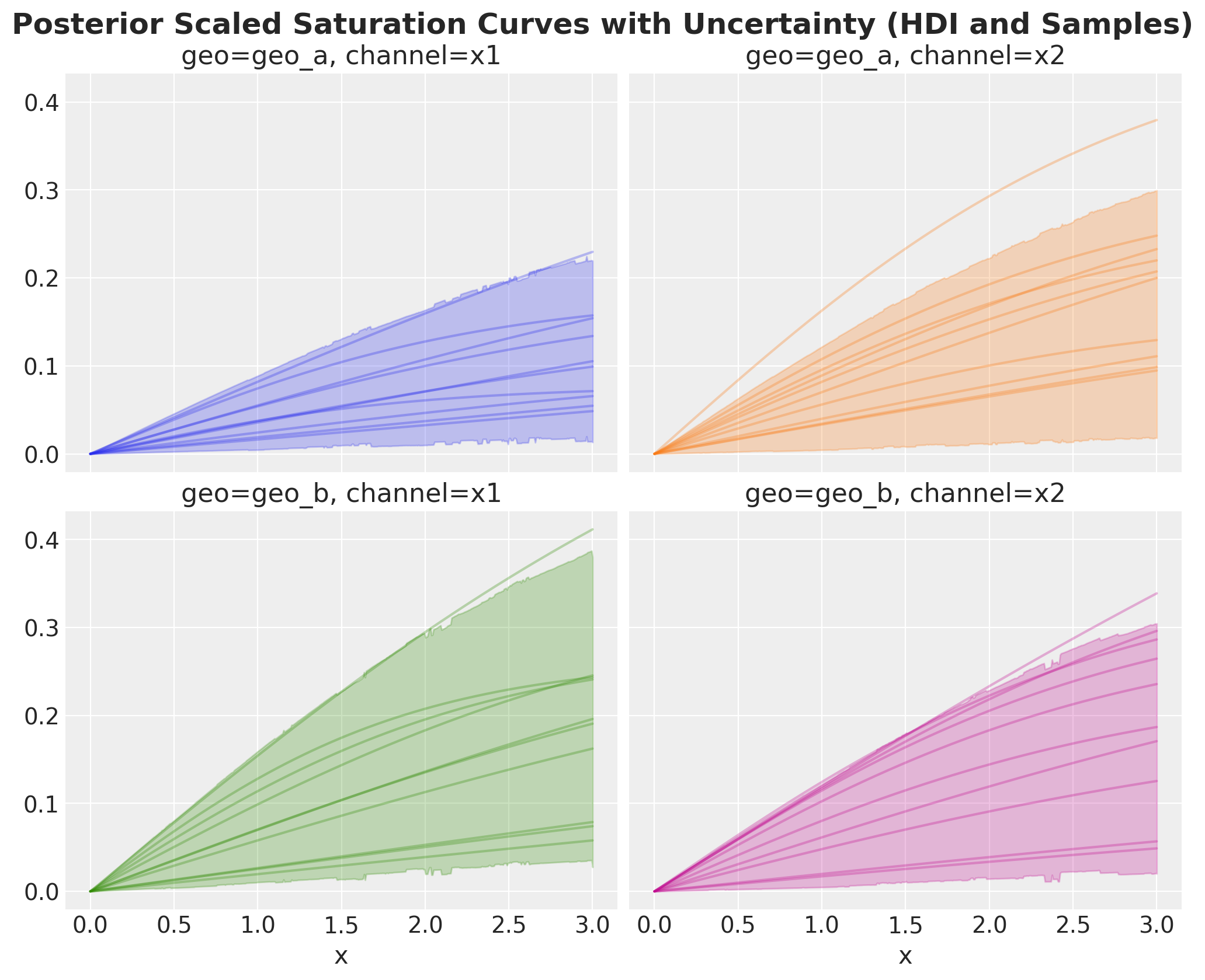 We can plot the posterior saturation curves for each channel and geography using the mmm.saturation.sample_curve method (please note you need to pass the whole posterior inference data!).
