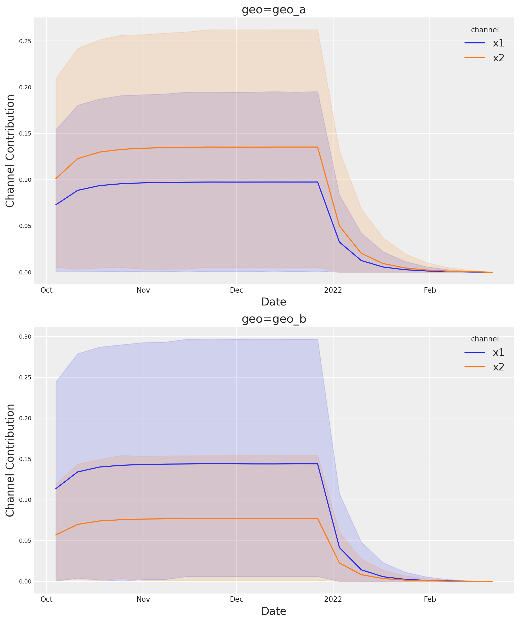 This notebook we’ll illustrate hierarchical modeling in MMM models. This can be controlled via the dims argument of Prior objects used in model_config. We’ll show you how to code each type of assumption you might make (we aren’t recommending it as a good model!).