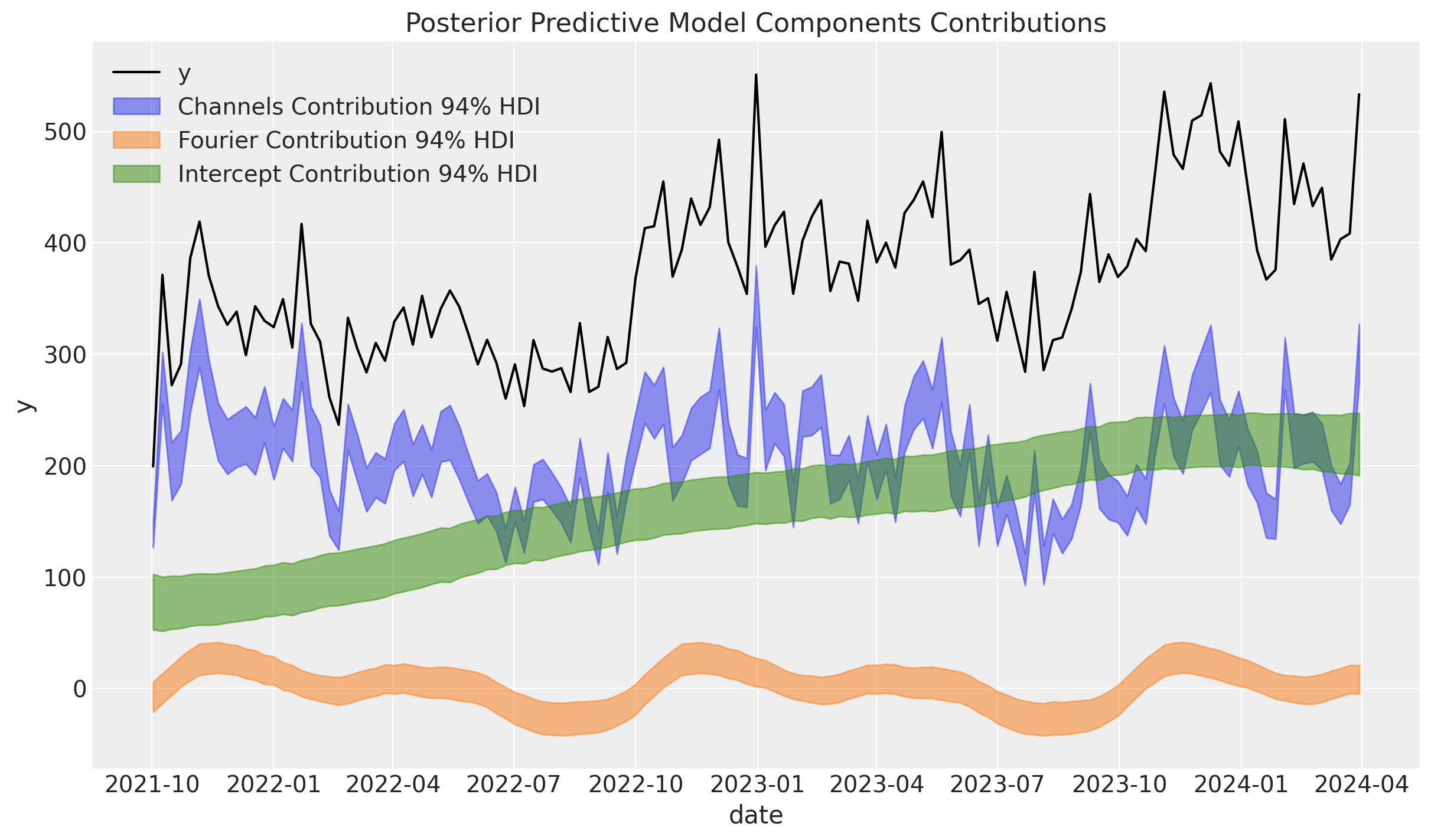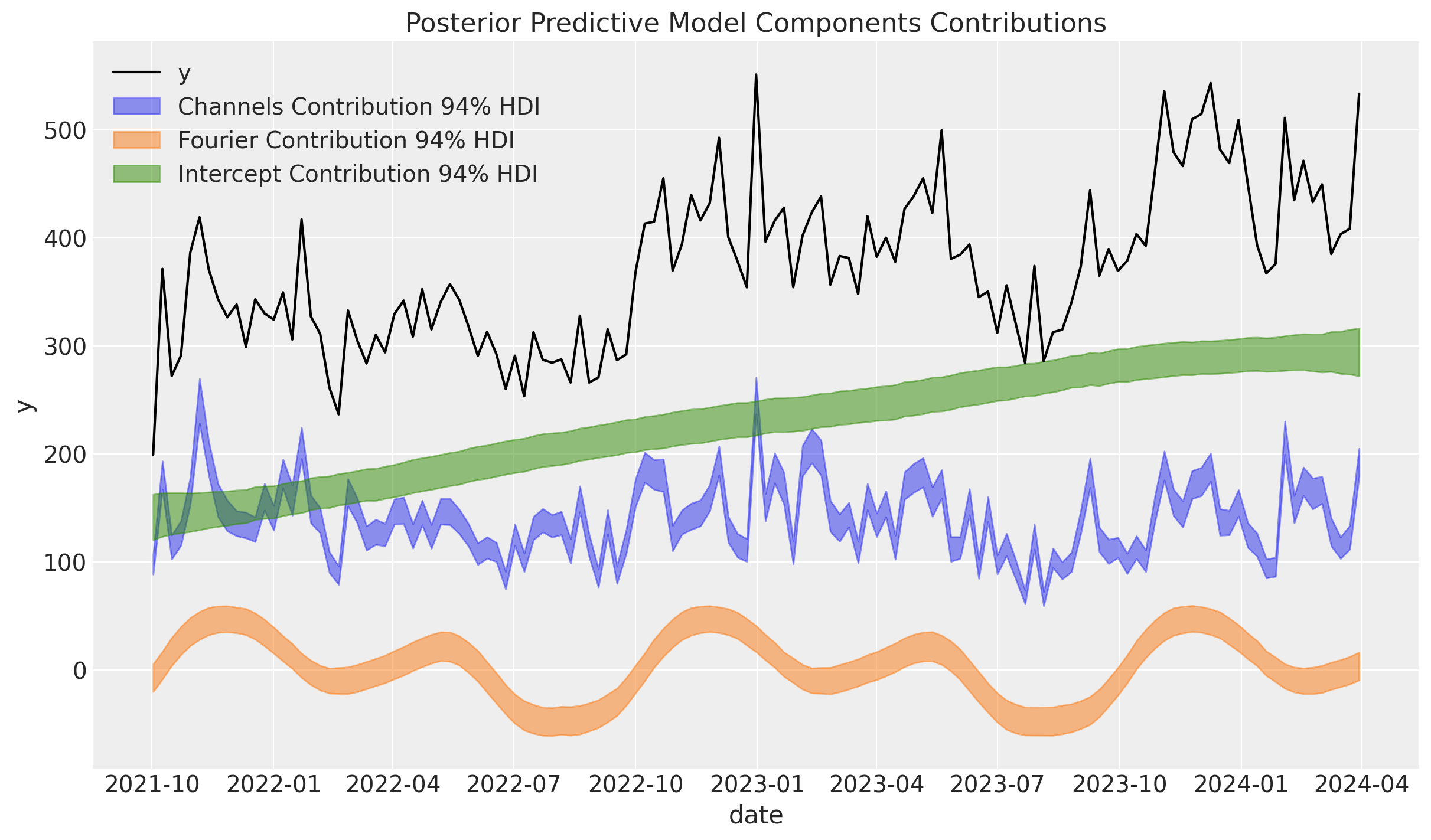 The contributions look much better and they are very close to the ones of the original blog post! Hence, these two approaches are very similar. However note that the PyMC-Marketing approach is more flexible as it allows to enrich the estimates with more test and different media spends to have a better understanding of the saturation effect.