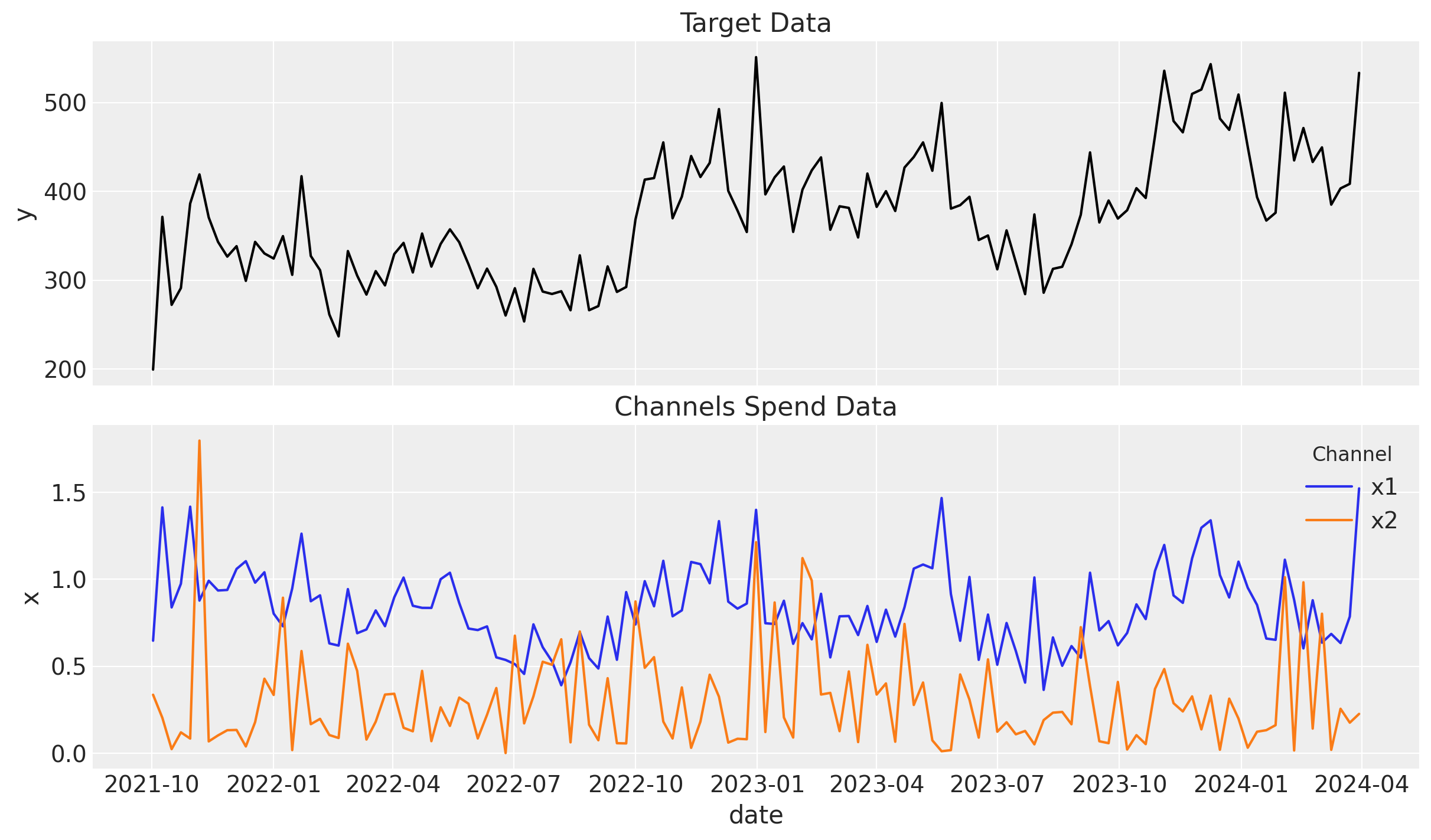 We are interested in the effect of the x1 and x2 channels on the y variable. We have additional covariates like yearly seasonality and a a non-linear trend component. In addition, there is an unobserved confounder z that affects both the channels and the target variable. This variable introduces a bias in the estimates if we do not account for it. However, for this problem we are going to assume that we do not have access to the z variable (hence, unobserved).